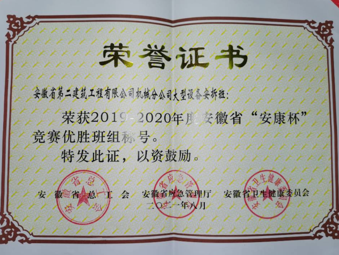 安徽二建公司機(jī)械分公司大型設(shè)備安拆班是一支負(fù)有戰(zhàn)斗力的班組,擔(dān)負(fù)全公司大型設(shè)備安拆維保任務(wù)。安拆班現(xiàn)有職工18人,包含4名黨員,4名入黨積極分子,主要負(fù)責(zé)大型設(shè)備的安拆、加節(jié)、維修保養(yǎng)及施工現(xiàn)場外電防護(hù)安裝作業(yè)等工作。多年來,安拆班始終堅(jiān)持安全生產(chǎn)理念,開展以“安全生產(chǎn)月”“安康杯”為重點(diǎn)的競賽活動(dòng)。從細(xì)節(jié)入手,樹立零違章理念,堅(jiān)持教育和懲罰相結(jié)合,落實(shí)責(zé)任、夯實(shí)基礎(chǔ),避免不安全事件的發(fā)生。通過強(qiáng)化管理較好的完成各項(xiàng)指標(biāo),班組曾多次獲得建工集團(tuán)、公司“先進(jìn)集體”等多項(xiàng)榮譽(yù)稱號(hào),2019年,分公司被合肥市建筑工程協(xié)會(huì)評(píng)為“2018年度起重設(shè)備安全管理先進(jìn)企業(yè)”,次年,又被合肥市建筑工程協(xié)會(huì)評(píng)為“2019年度合肥市建筑業(yè)優(yōu)秀起重設(shè)備安裝工程專業(yè)承包企業(yè)”。2020年,分公司大型設(shè)備安拆班榮獲2019-2020年度安徽省“安康杯”競賽優(yōu)勝班組稱號(hào),這份榮譽(yù)屬于公司,也屬于每一個(gè)奮勇投身特種設(shè)備安全的一線作業(yè)人員。