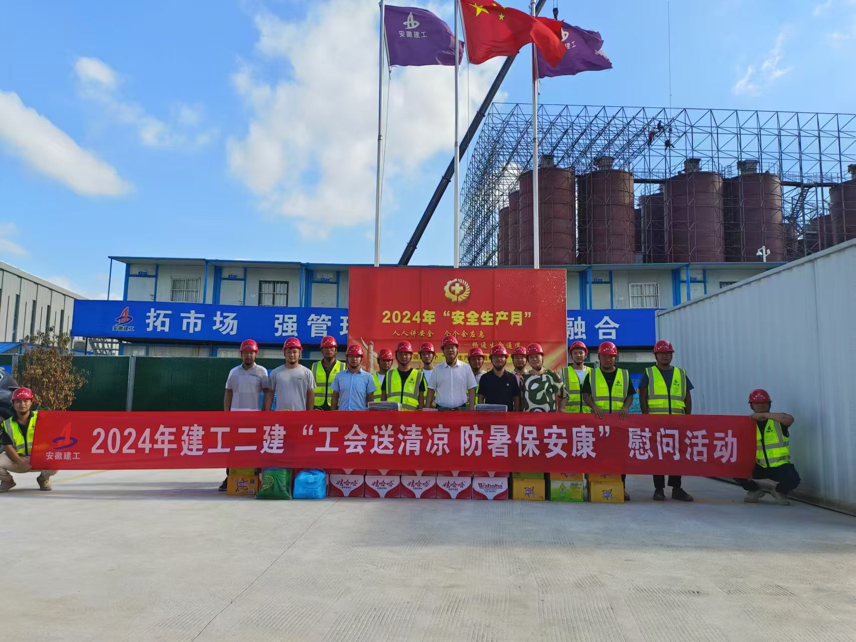 驕陽似火,酷暑難耐,為做好職工防暑降溫工作,有效防控高溫中暑事件和安全生產事故的發(fā)生,切實維護廣大職工的勞動安全和健康,7月25日,建工二建黨委副書記、總經理陶良敬赴安徽建工(蕪湖)新材料智能智造產業(yè)園項目開展送清涼慰問活動。建工建材蚌埠建材公司副經理邵亞飛參加慰問活動。
