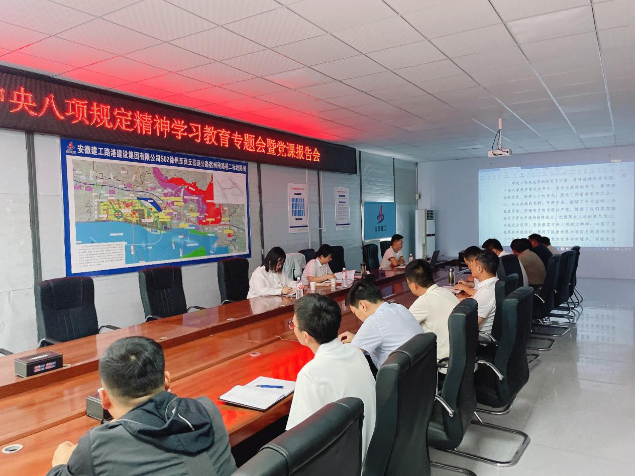 近日,宿州投發(fā)機(jī)關(guān)黨支部書記徐晶晶一行先后赴S02徐商高速路基二標(biāo)項(xiàng)目部、S02徐商高速路基一標(biāo)二分部項(xiàng)目部,開展深入貫徹中央八項(xiàng)規(guī)定精神學(xué)習(xí)教育專題會(huì)暨黨課報(bào)告會(huì)。機(jī)關(guān)黨支部書記徐晶晶講授黨課,黨支部委員陸冬領(lǐng)學(xué)相關(guān)內(nèi)容,項(xiàng)目部全體職工參加會(huì)議。