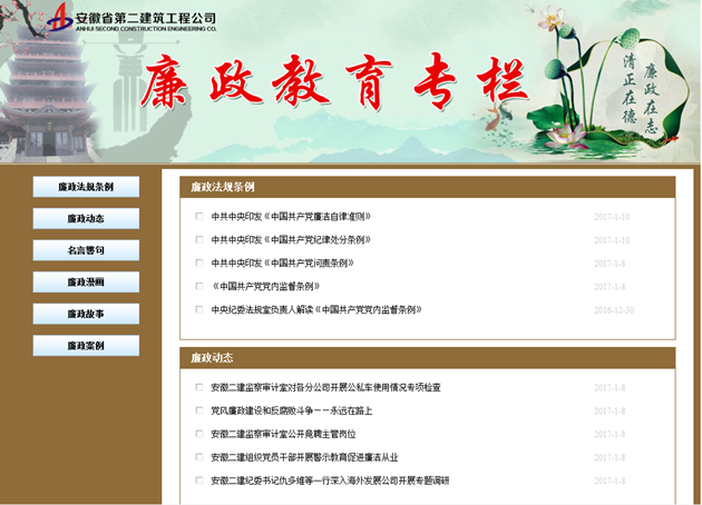 該專欄以公司網(wǎng)站為依托,設(shè)有廉政法規(guī)條例、廉政動(dòng)態(tài)、名言警句、廉政漫畫、廉政故事、廉政案例六大板塊。通過廉政法規(guī)條例,轉(zhuǎn)載《中國(guó)共產(chǎn)黨廉潔自律準(zhǔn)則》、《中國(guó)共產(chǎn)黨紀(jì)律處分條例》、《中國(guó)共產(chǎn)黨問責(zé)條例》、《安徽省預(yù)防職務(wù)犯罪條例》等一系列黨紀(jì)黨規(guī)、國(guó)家法律法規(guī)知識(shí),并在每一次修訂后及時(shí)更新,為廣大黨員干部學(xué)習(xí)使用提供方便。運(yùn)用廉政動(dòng)態(tài),及時(shí)發(fā)布集團(tuán)紀(jì)委和公司黨委、紀(jì)委通知要求,通報(bào)監(jiān)察審計(jì)事項(xiàng)與結(jié)果,做到監(jiān)督的公開化、透明化。以名言警句、廉政漫畫、廉政故事、廉政案例感染人、陶冶人,內(nèi)容直觀形象,用勤廉典型激勵(lì)人,深入剖析典型違紀(jì)案例,加強(qiáng)警示教育。