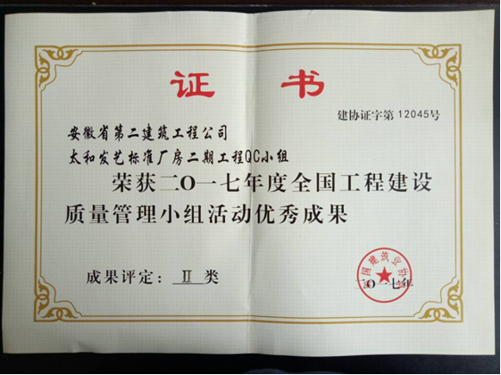 6月27—30日,安徽二建四分公司太和發(fā)藝標準廠房二期工程QC小組參加了由中國建筑業(yè)協(xié)會在四川成都主辦的全國工程建設優(yōu)秀質(zhì)量管理小組活動成果交流會。經(jīng)過激烈的評比,太和發(fā)藝標準廠房二期工程QC小組《提高混凝土框架柱觀感質(zhì)量合格率》憑借著“高標準、嚴要求”的技術(shù)管控榮獲2017年度全國工程建設優(yōu)秀QC成果二等獎。