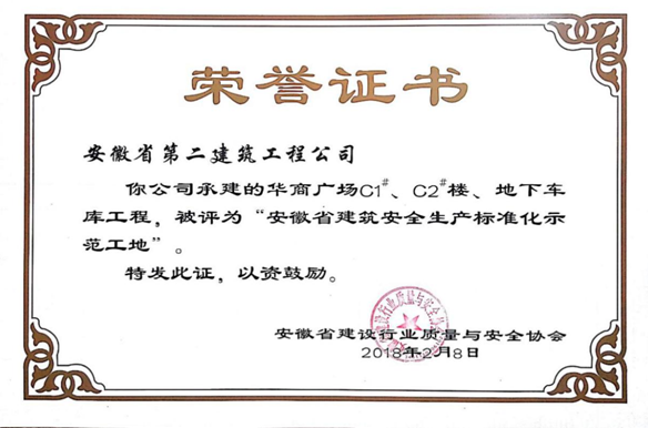 由三分公司承建的華商廣場C1、C2#樓、地下車庫項目與2018年2月8日正式被安徽省建設行業(yè)質量與安全協(xié)會評為“安徽省建筑安全生產標準化示范工地”稱號,近日正式授牌。