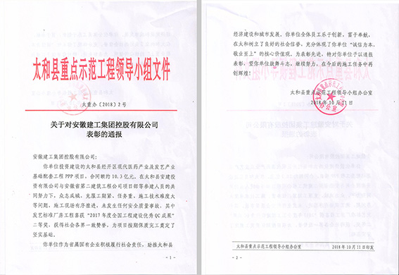 經(jīng)過兩年的“浴血奮戰(zhàn)”,2018年9月30日,太和PPP項目完成交工驗收工作,項目建設(shè)圓滿收官,并受到太和縣人民政府及太和縣重點(diǎn)示范工程領(lǐng)導(dǎo)小組辦公室的一致表彰,為公司品牌宣傳,形象提升做出積極努力,為“打造一流安徽建工”添磚加瓦。