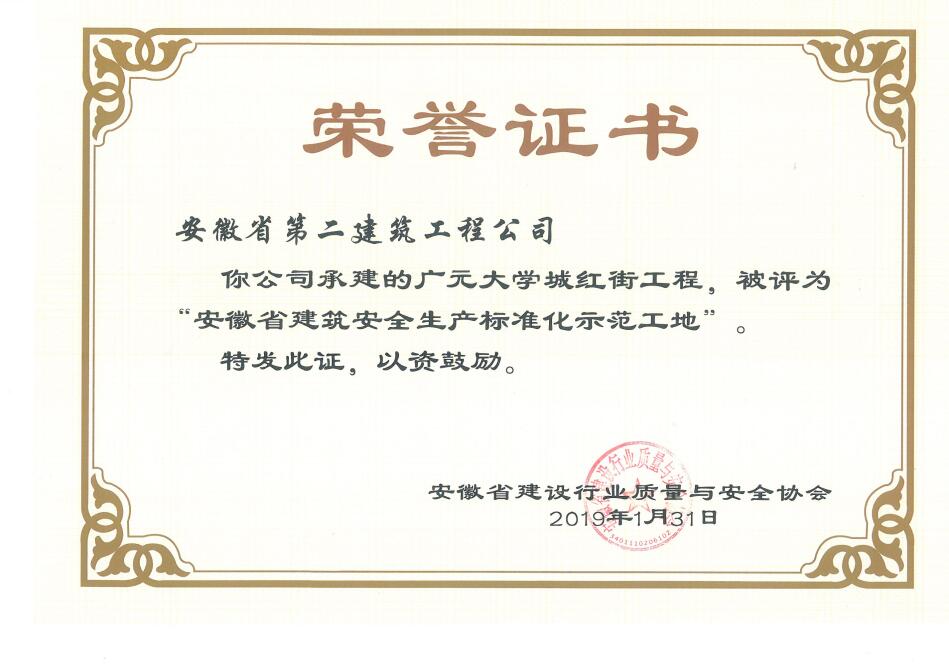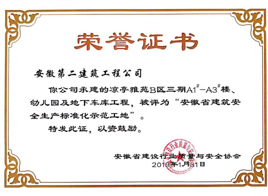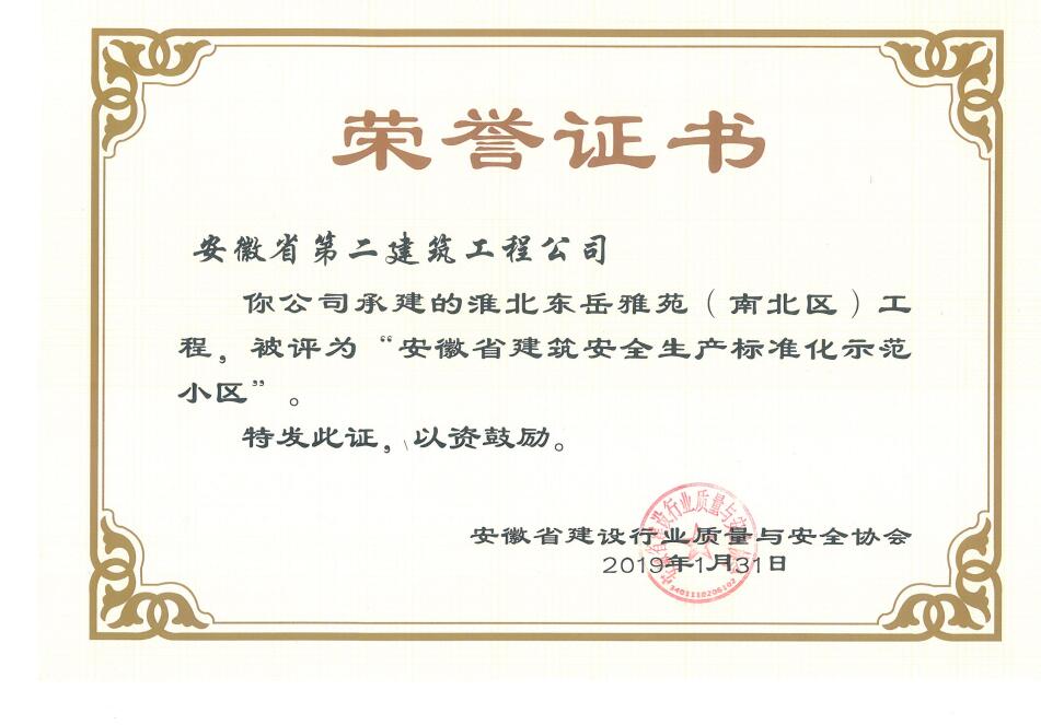 近日,從安徽省建設(shè)行業(yè)質(zhì)量與安全協(xié)會獲悉,安徽二建承建的肥西涼亭雅苑、阜陽楓林源筑、阜陽廣元大學(xué)城、宿州恒馨印象、淮北東岳雅苑5個(gè)項(xiàng)目獲得2018年度“安徽省建筑施工安全生產(chǎn)標(biāo)準(zhǔn)化示范工地”稱號,為公司再添榮譽(yù)。