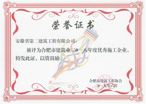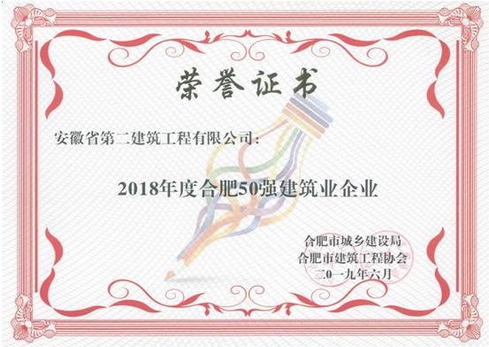 日前,公司被合肥市城鄉(xiāng)建設委員會、合肥市建筑工程協(xié)會授予“2018年度合肥市50強建筑業(yè)企業(yè)”、“優(yōu)秀施工總承包企業(yè)”、“質量管理先進企業(yè)”、“安全管理先進企業(yè)”、“外向輸出先進企業(yè)”、“統(tǒng)計管理先進企業(yè)”、“起重設備安全管理先進企業(yè)”。張尚禮同志獲“安徽省優(yōu)秀項目經(jīng)理”稱號,崔俊、鄭慧君、任兵三名同志獲“合肥市優(yōu)秀項目經(jīng)理”稱號;蒯家江同志獲“合肥市外向輸出先進個人”稱號;曹建同志獲“合肥市安全管理先進個人”稱號;王貴宏同志獲“合肥市質量管理先進個人”稱號;周俊同志獲“合肥市起重設備安全管理先進個人”稱號。
