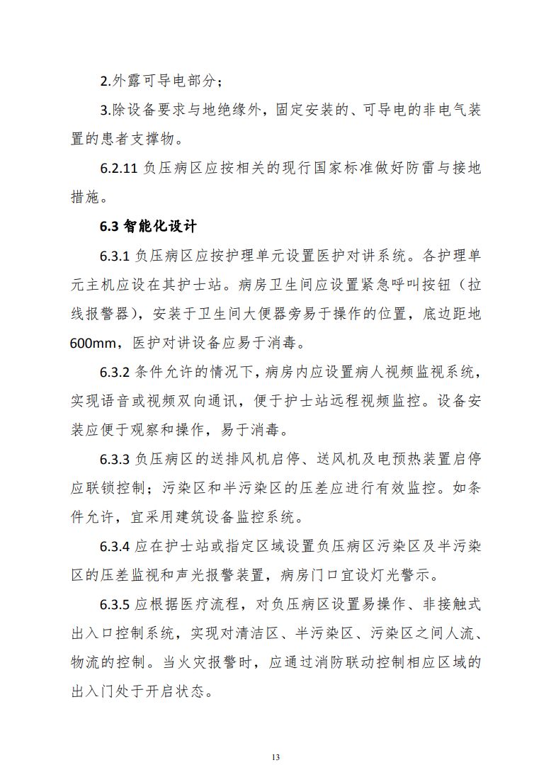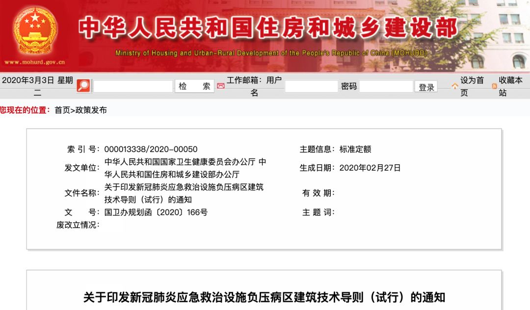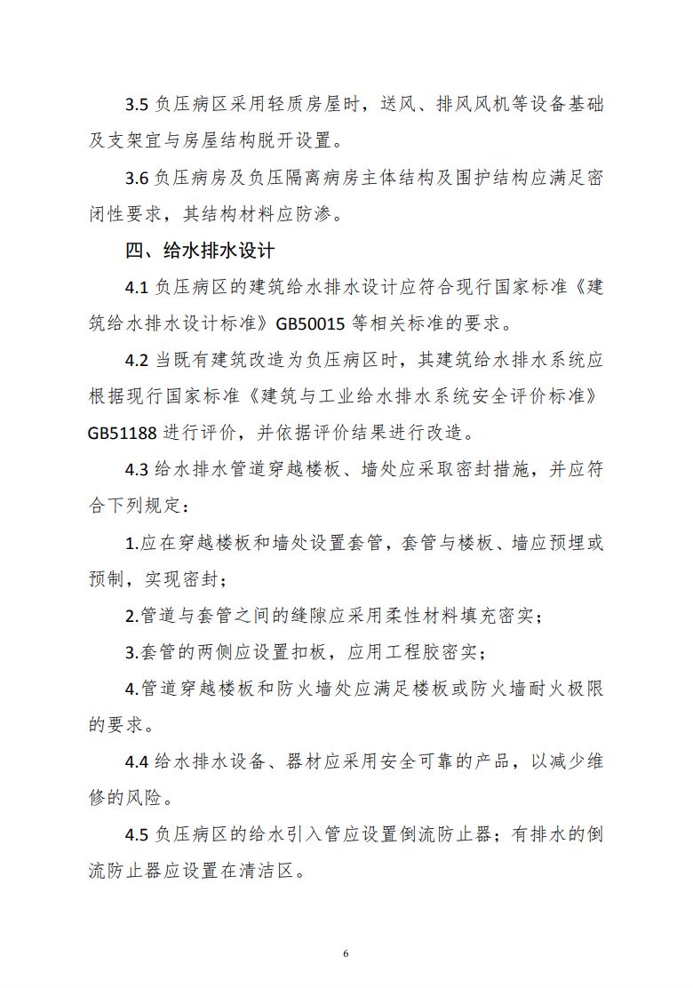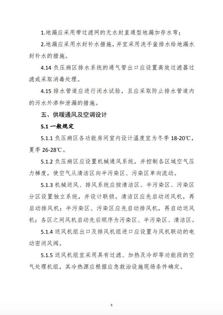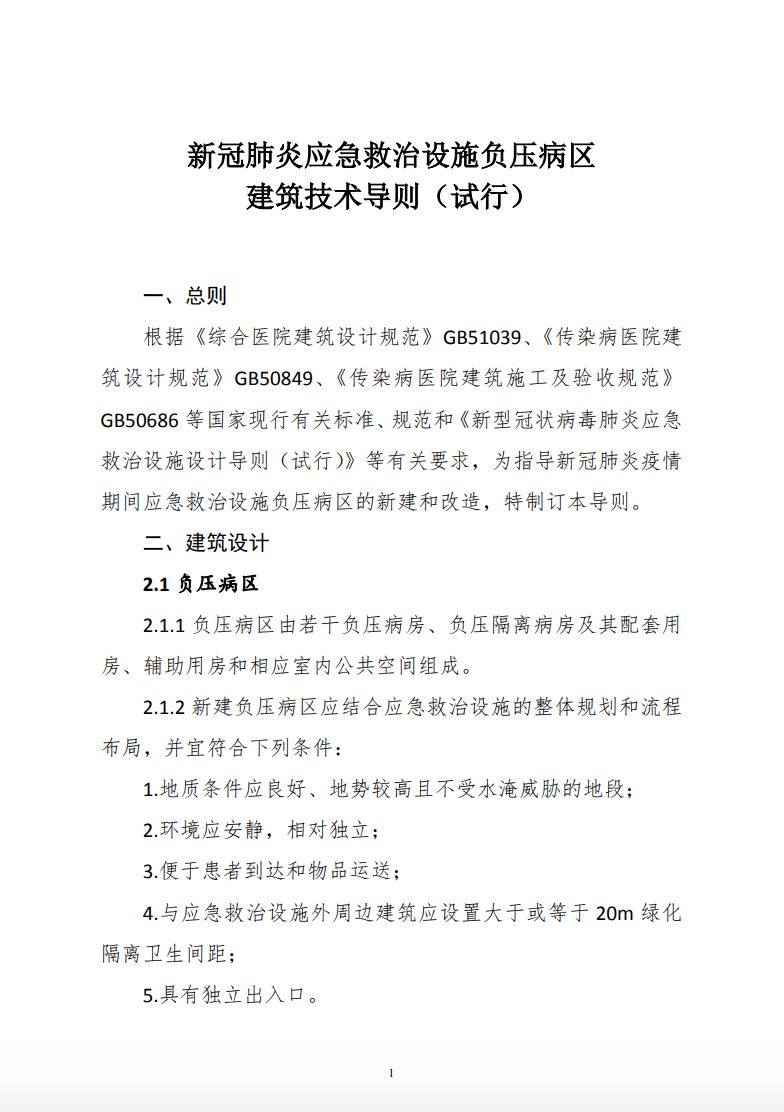 為進(jìn)一步做好新冠肺炎疫情防控工作,加強(qiáng)新冠肺炎應(yīng)急救治設(shè)施建設(shè),國家衛(wèi)健委辦公廳、住房和城鄉(xiāng)建設(shè)部辦公廳近日聯(lián)合印發(fā)《新冠肺炎應(yīng)急救治設(shè)施負(fù)壓病區(qū)建筑技術(shù)導(dǎo)則(試行)》,供各地結(jié)合防疫工作和實(shí)際需要參考執(zhí)行。導(dǎo)則包括建筑設(shè)計(jì)、結(jié)構(gòu)設(shè)計(jì)、給水排水設(shè)計(jì)、供暖通風(fēng)及空調(diào)設(shè)計(jì)、電氣及智能化設(shè)計(jì)、運(yùn)行維護(hù)等8個(gè)方面。