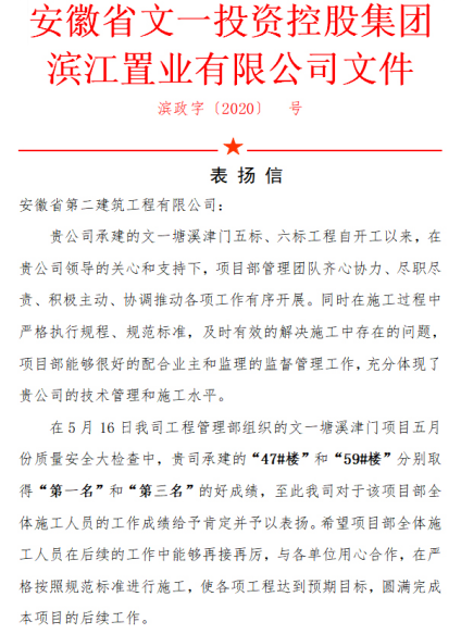 安徽二建文一·塘溪津門五標(biāo)項目管理團隊堅持疫情防控與復(fù)工復(fù)產(chǎn)兩手抓、兩手硬,管理團隊齊心協(xié)力、盡職盡責(zé)、積極主動,保質(zhì)保量完成施工任務(wù)。在5月16日安徽省文一投資控股集團濱江置業(yè)有限公司工程管理部組織的五月份質(zhì)量安全大檢查中,“47#樓”取得第一名的好成績,獲建設(shè)單位通報表揚。