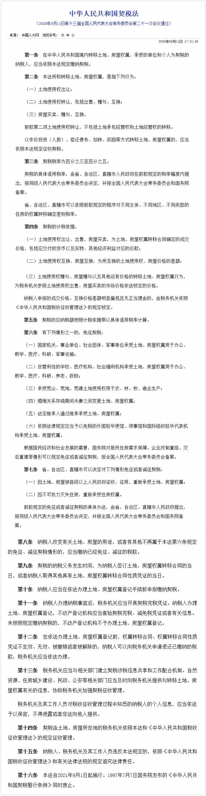 與房屋買賣相關(guān)的《中華人民共和國契稅法》(以下簡稱《契稅法》)在8月11日的第十三屆全國人民代表大會常務(wù)委員會第二十一次會議通過,并將于2021年9月1日起施行。