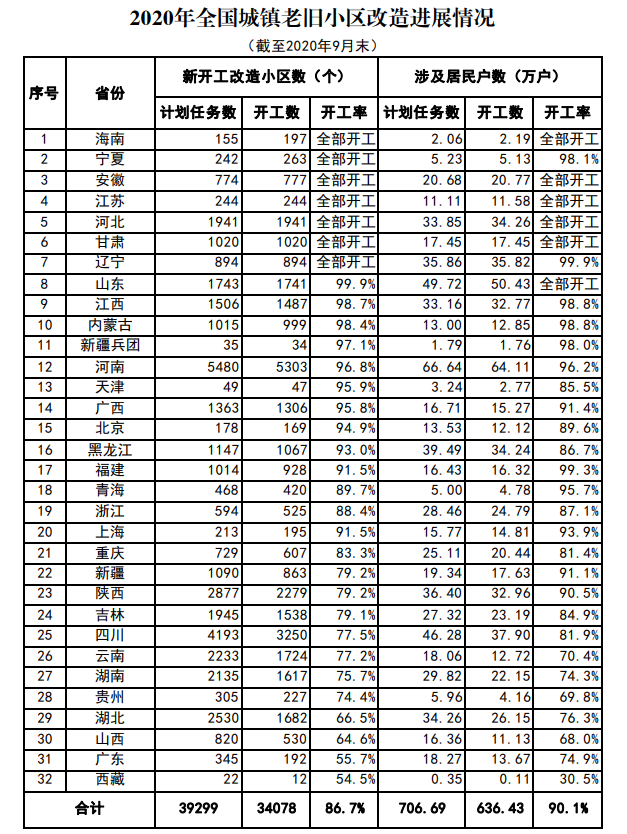 其中,按小區(qū)數(shù)計(jì),開(kāi)工進(jìn)展較快的地區(qū):海南、寧夏、安徽、江蘇、河北、甘肅、遼寧等7省份開(kāi)工率均已達(dá)到或超過(guò)100%;開(kāi)工進(jìn)展較慢的地區(qū):貴州74.4%,湖北66.5%,山西64.6%,廣東55.7%,西藏54.5%。