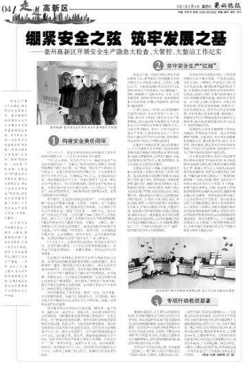 年后復(fù)工不久,亳州市高新區(qū)即對轄區(qū)內(nèi)的施工單位進(jìn)行逐個復(fù)工復(fù)產(chǎn)以及安全生產(chǎn)隱患大檢查、大管控、大整治。3月3日上午,亳州市高新區(qū)建管主任、第五管理中心主任、環(huán)保中心主任等領(lǐng)導(dǎo)以及亳州市記者來到亳州濱江壹號項目進(jìn)行實地現(xiàn)場檢查,并采訪了項目經(jīng)理朱曉亮。在聽取項目匯報、查閱安全管控資料后,當(dāng)?shù)馗髦鞴懿块T領(lǐng)導(dǎo)充分肯定了項目在現(xiàn)場安全、環(huán)保管控等方面的有力舉措,并在亳州晚報上刊登了項目全方位的安全管理體系。