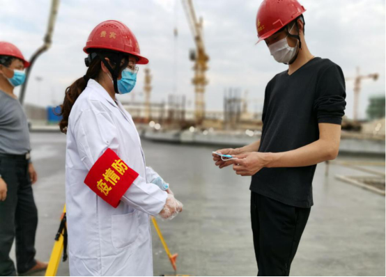 項(xiàng)目防疫小組成員為勞務(wù)人員發(fā)放口罩