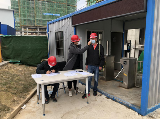 一線人員進(jìn)入工地,測(cè)量體溫