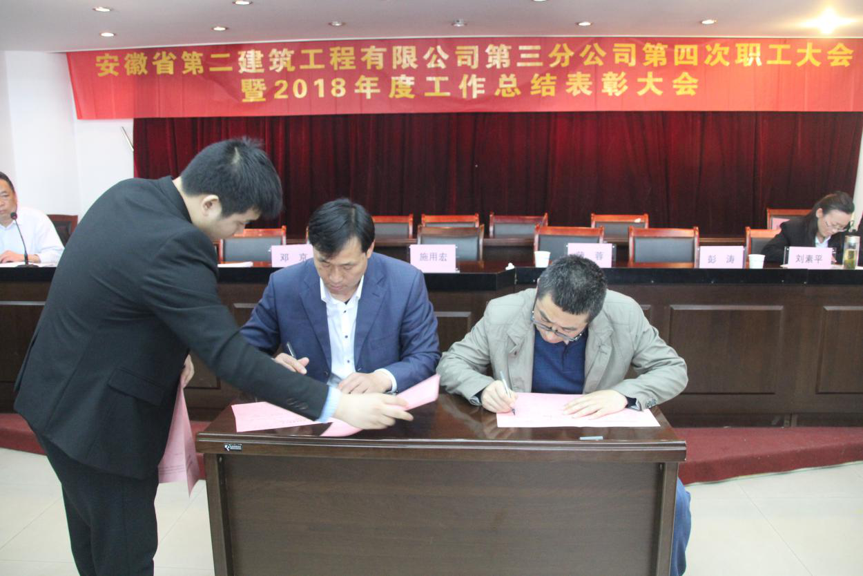 會上,公司黨委工作部對分公司領(lǐng)導(dǎo)班子及班子成員進行民主測評,對后備干部進行民主推薦;馬福才經(jīng)理和各項目經(jīng)理簽訂《目標責(zé)任狀》、《勞動競賽責(zé)任狀》,為各責(zé)任主體完成全年指標下達了“任務(wù)書”、確立了考核依據(jù);對過去一年在各自崗位上作出突出貢獻的先進科室、項目及個人進行表彰,更好地發(fā)揮了榜樣引領(lǐng)作用,促進形成崇尚先進、學(xué)習(xí)先進、爭當(dāng)先進的良好氛圍。