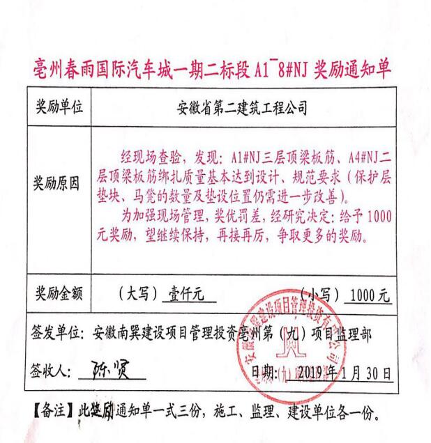 近日,安徽南巽建設(shè)項(xiàng)目管理投資有限公司對(duì)亳州春雨國(guó)際汽車城一期二標(biāo)段A1#NJ-A8#NJ樓項(xiàng)目的A1#樓三層頂梁板及A4#樓二層頂梁板鋼筋進(jìn)行現(xiàn)場(chǎng)檢查,肯定鋼筋綁扎質(zhì)量達(dá)到設(shè)計(jì)、規(guī)范要求。為加強(qiáng)現(xiàn)場(chǎng)管理,獎(jiǎng)優(yōu)罰劣,經(jīng)其研究決定給予項(xiàng)目部1000元獎(jiǎng)勵(lì)。雖然獎(jiǎng)勵(lì)金額不大,但說(shuō)明了建設(shè)單位對(duì)項(xiàng)目部管理人員認(rèn)真負(fù)責(zé)、一絲不茍工作態(tài)度的認(rèn)可,展現(xiàn)了公司創(chuàng)優(yōu)質(zhì)工程決心,體現(xiàn)了質(zhì)量為本的生產(chǎn)管理理念。項(xiàng)目部將繼續(xù)努力,從小事做起,從管理好現(xiàn)場(chǎng)做起,從保證安全質(zhì)量做起,發(fā)揚(yáng)安徽二建“團(tuán)結(jié)、拼搏、求實(shí)、創(chuàng)新”的企業(yè)精神。