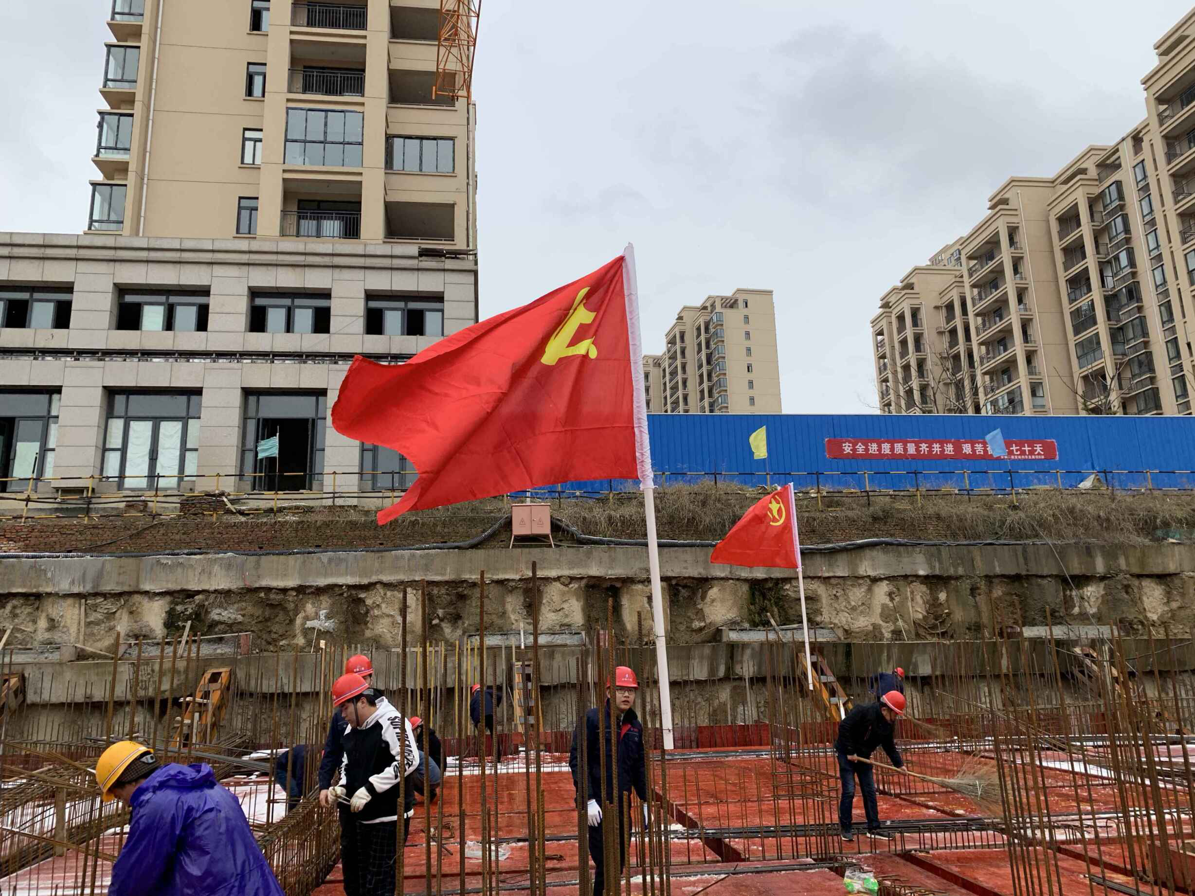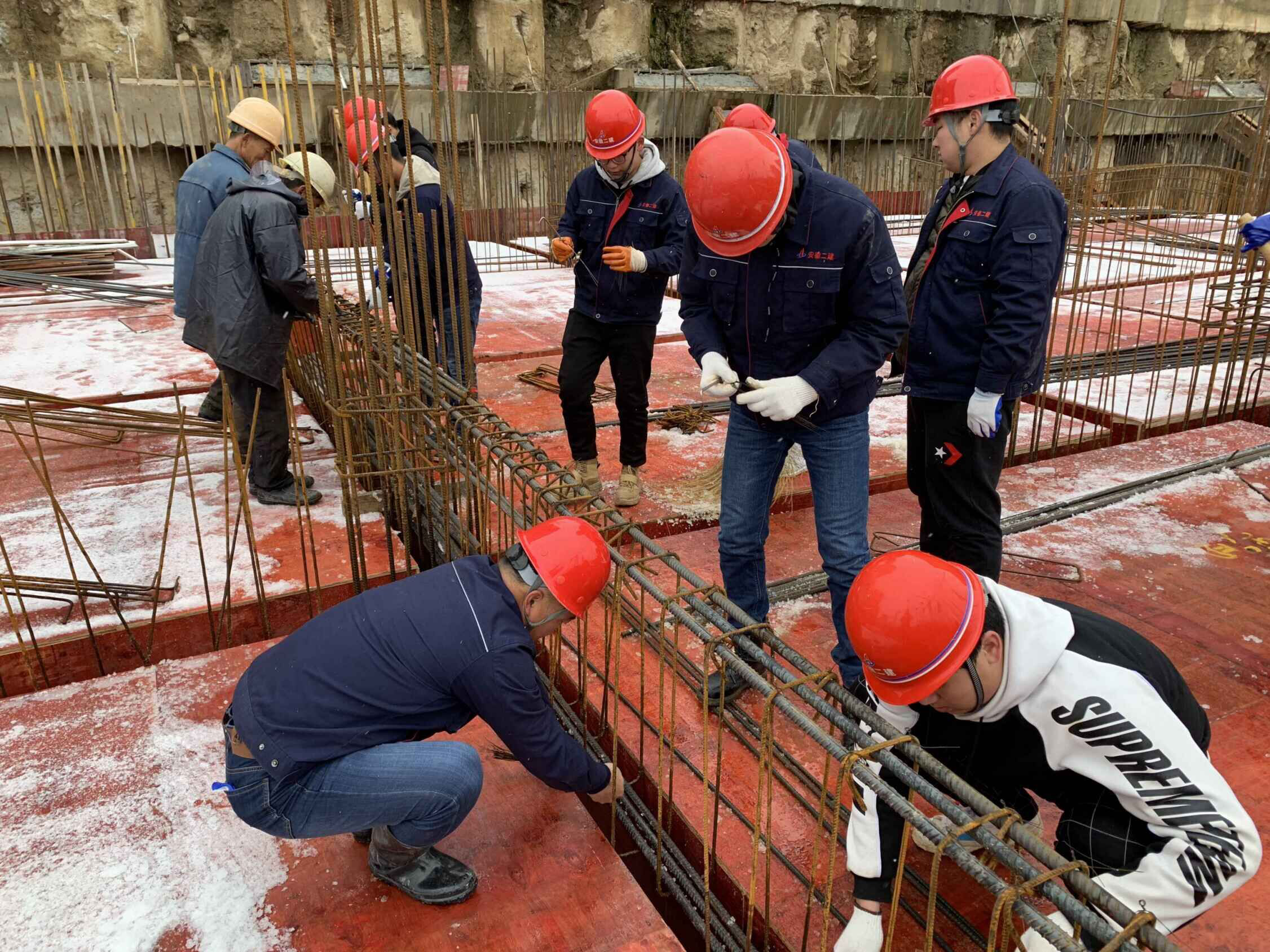 8日,大雪紛紛揚(yáng)揚(yáng)下了一天,為更好的激勵各班組保安全、促生產(chǎn)。在項(xiàng)目黨支部和共青團(tuán)的帶領(lǐng)下,管理人員與班組工人一同綁扎鋼筋。雖然雪花飛舞,寒風(fēng)刺骨,但大家無一人退縮,綁扎鋼筋超過了工人擺放鋼筋的速度。