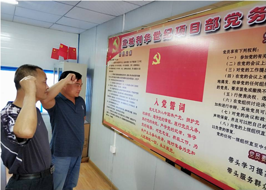 7月1日上午,項目部兩位黨員緊握右拳,面向鮮紅黨旗,重溫入黨誓詞?;仡櫲朦h宣誓時的莊嚴承諾和堅定決心,增強黨性意識,以更加飽滿的熱情發(fā)揮共產黨員的先鋒模范作用,永葆共產黨的政治本色。項目部19名成員抒寫了“我的承諾”,將一腔熱血鐫刻在紅色信紙上,并莊嚴鄭重的張貼上了宣傳欄,接受同志監(jiān)督,時刻提醒自己。不忘初心,立足崗位,提質降本增效,以實際行動向七•一獻禮。