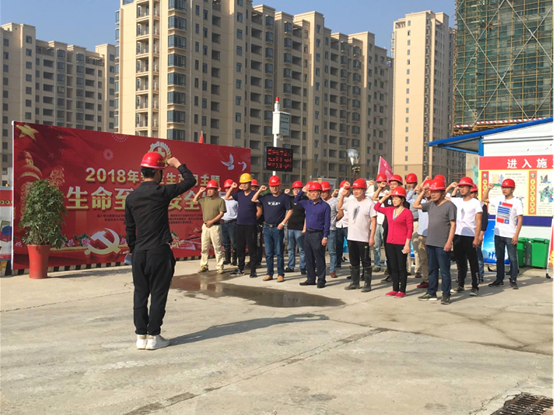 上午8點(diǎn),項(xiàng)目經(jīng)理張尚禮傳達(dá)了公司關(guān)于開展安全生產(chǎn)月主題及宣誓活動(dòng)的精神,對(duì)活動(dòng)提出了要求。隨后專職安全員劉振中帶領(lǐng)項(xiàng)目全體員工莊嚴(yán)地舉起右手鄭重宣誓,并在“生命至上,安全發(fā)展”橫幅上簽字。