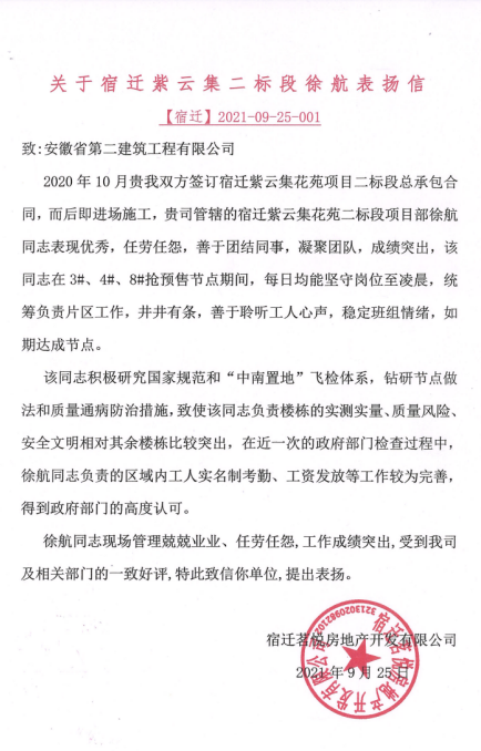 近日,第三分公司宿遷中南紫云集花苑項(xiàng)目的施工員徐航收到了一封業(yè)主單位發(fā)來的表揚(yáng)信,平日大方灑脫的他在收到信后露出了靦腆的笑容,他表示:“這是自己的分內(nèi)工作,以后會繼續(xù)保持”。平日里的徐航工作責(zé)任心強(qiáng),在項(xiàng)目3#、4#、8#搶收節(jié)點(diǎn)期間,兢兢業(yè)業(yè)堅(jiān)守崗位,每日加班加點(diǎn)至凌晨,在他和所在片區(qū)工人的努力下,項(xiàng)目如期完成節(jié)點(diǎn)任務(wù)。針對項(xiàng)目現(xiàn)場工作總是親歷親為,在面對裝配式項(xiàng)目的施工難點(diǎn)、重點(diǎn)工作時,通過對專業(yè)書籍的學(xué)習(xí),不斷攻堅(jiān)克難,提高能力,增強(qiáng)技能。他負(fù)責(zé)的片區(qū)在質(zhì)量風(fēng)險(xiǎn)、勞務(wù)實(shí)名制等方面工作明顯優(yōu)于其他樓棟的工作,在業(yè)主方“飛檢”、政府檢查中得到高度認(rèn)可。