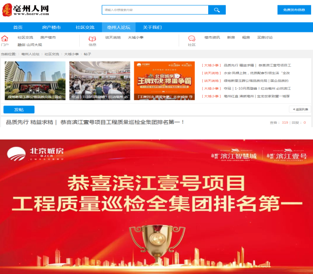 近日,安徽二建第四分公司亳州濱江壹號(hào)項(xiàng)目在北京城房集團(tuán)6個(gè)城市40個(gè)精品工程質(zhì)量巡檢中脫穎而出,喜獲第一名。