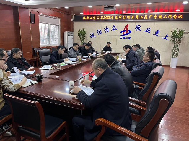 2月16日下午,安徽二建公司在一樓會(huì)議室召開了節(jié)后項(xiàng)目復(fù)工復(fù)產(chǎn)專題工作會(huì)議。公司總經(jīng)理李建成、財(cái)務(wù)總監(jiān)王干出席會(huì)議,會(huì)議由副總經(jīng)理葉和永主持。公司工程管理部、法務(wù)部(債權(quán)回收辦)、財(cái)務(wù)資產(chǎn)部、物資設(shè)備部、成本合約部、安全管理部、技術(shù)質(zhì)量部負(fù)責(zé)人、所屬各單位經(jīng)理、生產(chǎn)副經(jīng)理參會(huì)。
