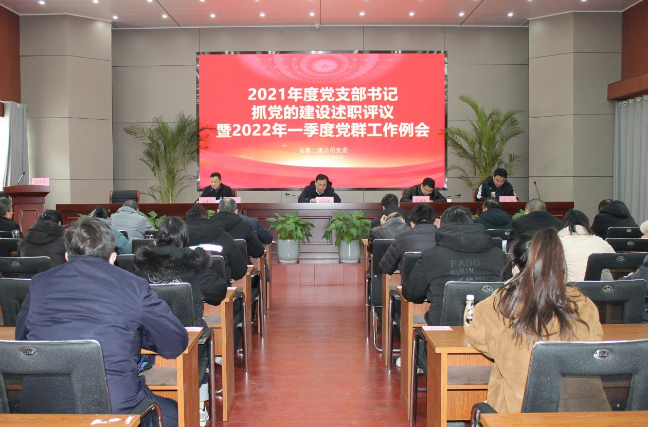 2月21日下午,安徽二建公司在新會(huì)議室召開2021年度基層黨支部書記抓黨的建設(shè)述職評議暨2022年一季度黨群工作例會(huì)。公司黨委書記、董事長許業(yè)勇,黨委副書記、總經(jīng)理李建成,黨委副書記、工會(huì)主席王軍,黨委委員、紀(jì)委書記沈壯出席會(huì)議,公司黨群部門人員、所屬各單位黨支部書記、團(tuán)支部書記、綜合辦負(fù)責(zé)黨務(wù)工作人員參會(huì)。會(huì)議由王軍主持。