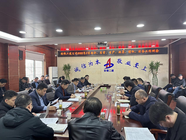 春潮涌動,新意盎然。3 月7日下午,安徽二建公司在一樓會議室召開了2022年3月安全、質(zhì)量、生產(chǎn)、決算、債權(quán)、法務(wù)工作例會。公司總經(jīng)理李建成、副總經(jīng)理費(fèi)勤波出席會議,公司相關(guān)部門負(fù)責(zé)人、所屬各單位經(jīng)理、分管領(lǐng)導(dǎo)及工管、安全科長參加會議,副總經(jīng)理葉和永主持會議。
