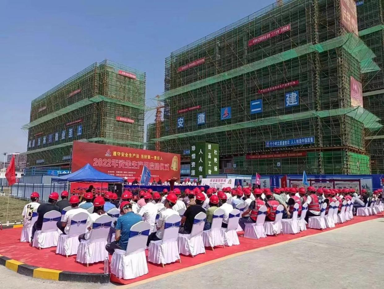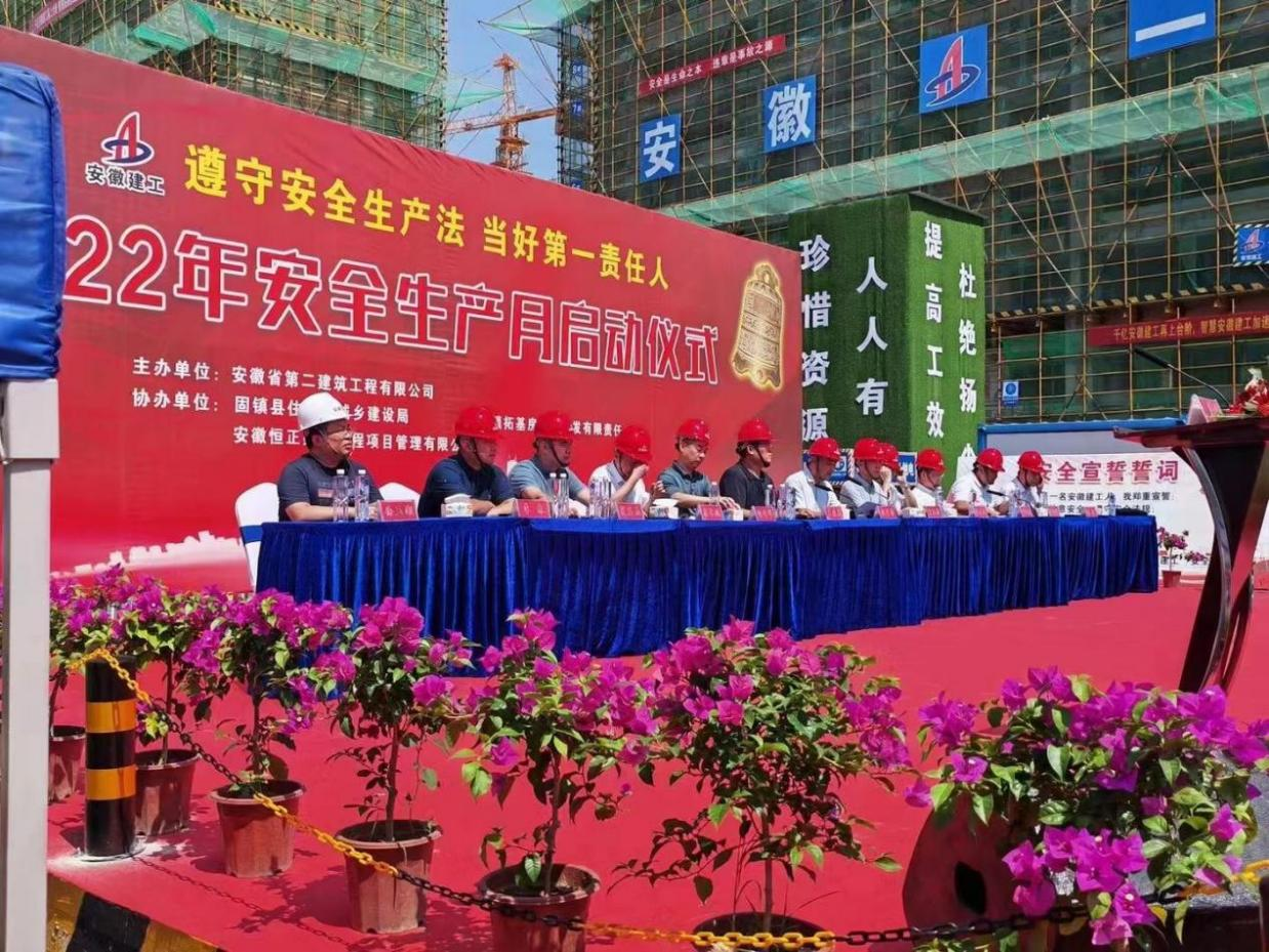 6月18日,安徽二建在固鎮(zhèn)鼎元名邸項(xiàng)目、蚌埠紫金云城項(xiàng)目舉辦2022年安全生產(chǎn)月活動(dòng)啟動(dòng)儀式暨現(xiàn)場(chǎng)觀摩交流活動(dòng)。固鎮(zhèn)縣住房和城鄉(xiāng)建設(shè)局局長(zhǎng)劉安、應(yīng)急管理局局長(zhǎng)宋洪濤等主管單位代表,蚌埠拓基房地產(chǎn)開發(fā)有限責(zé)任公司總經(jīng)理何世華等業(yè)主方代表,安徽二建公司黨委副書記、總經(jīng)理李建成,副總經(jīng)理葉和永,副總經(jīng)理、總工程師費(fèi)勤波等參加活動(dòng),活動(dòng)由葉和永主持。