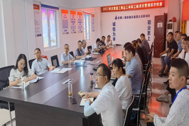 為扎實推進“項目基礎管理年”活動,以檢查促落實、促整改、促提升,2022年6月28日,建工股份公司工程管理部(安全監(jiān)察局)督查員范毓慶一行8人赴安徽二建固鎮(zhèn)拓基鼎元名邸項目,開展上半年工程項目管理綜合檢查工作。安徽二建公司黨委委員、副總經(jīng)理葉和永,總經(jīng)理助理、第一分公司經(jīng)理崔書斌及公司相關(guān)職能部門負責人參加。