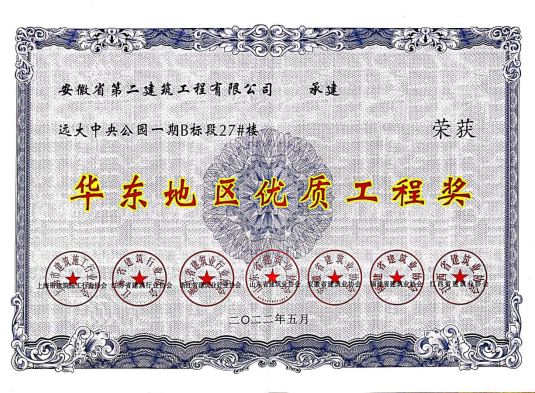 近日,由安徽二建公司承建的“舒城遠大中央公園工程一期B標27#樓”工程被授予了“2021年度‘華東地區(qū)優(yōu)質工程獎’”榮譽稱號。