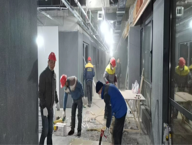 自11月底接到肥東縣委縣政府主要領(lǐng)導(dǎo)指示,公共衛(wèi)生綜合樓須提前交付,投入疫情防控使用。根據(jù)公司搶工動(dòng)員大會(huì)精神,第二分公司、項(xiàng)目部迅速行動(dòng)起來(lái),分公司領(lǐng)導(dǎo)親自指揮,全員行動(dòng),火速調(diào)配勞動(dòng)力、材料物資、機(jī)械設(shè)備等資源力量,投入搶工戰(zhàn)役。一天之內(nèi),編排好詳細(xì)的搶工倒排施工計(jì)劃、實(shí)施方案、保證措施,同時(shí)成立各作戰(zhàn)小組,確保各項(xiàng)任務(wù)如期完成。截止目前,外立面裝飾已完成,除五樓由院方負(fù)責(zé)外,各樓層水電消防橋架暖通空調(diào)智能化等穿線(xiàn)、管道設(shè)備安裝已全部完成,裝飾裝修進(jìn)入到攻堅(jiān)階段。地墻面磚已鋪貼完畢,油漆涂料正在收尾。病房?jī)?nèi)吊頂正在安裝,墻面冰火板已安裝鋪貼50%,pvc地板自流平地坪已完成澆筑,室外道排已完成一半,正在全力沖刺最后目標(biāo)。在搶工同時(shí),質(zhì)量和安全也毫不放松,確保“黃山杯”創(chuàng)建,優(yōu)化工藝,提升質(zhì)量標(biāo)準(zhǔn)。安全檢查日查日?qǐng)?bào),及時(shí)消除隱患。