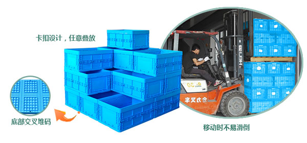 5、防滑防倒:箱子底部交叉堆碼,卡扣設(shè)計,任意疊放,防止箱子在移動時因堆高而易滑倒